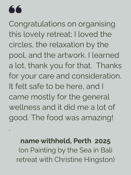 " I am thrilled to offer a week-long art retreat in Bali, designed to inspire your creative spirit and help you tap into your unique artistic voice. Each day, you’ll create a finished artwork using expressive techniques that I’ll demonstrate and guide you through, drawing inspiration from the beauty, rhythm, and energy of Bali itself ."