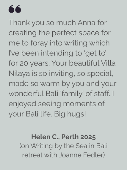 This retreat answers a long-held desire to work with Jody Graham, whose work I've admired for years! I'm thrilled to share this week with Jody, with you, and with the bird life, beautiful Balinese people who work with is, and the bugs that never cease to cause me to draw breath ... all this and more abounds in beautiful Villa Nilaya by the sea. See you there!